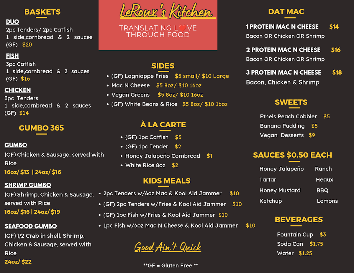 From a reviewer’s perspective, the menu at Leroux’s Kitchen keeps things simple yet satisfying, focusing on comforting Southern-style staples. The Daily Specials offer hearty combinations like 2Pc Chicken Tenders & 6oz Plain Mac N Cheese, 2Pc Chicken Tenders & Fries, and 2Pc Fried Fish W/ 6oz Mac N Cheese, alongside a mix option of 1pc Chkn Tender, 1pc Fried Fish & 6oz Plain Mac N Cheese, making it easy to enjoy classic pairings without overthinking. The entrée selection highlights rich, flavorful dishes such as Shrimp Gumbo 16oz and Chicken & Sausage Gumbo 16oz, while baskets like the Fish Basket, Chicken Basket, and Duo Basket cater to those craving crispy, fried comfort food. On the side, items like Honey Jalapeño Cornbread, Lanyap Fries, and both 8oz Plain Mac N Cheese and 16oz Plain Mac N Cheese round out the experience, with an additional option of 8oz Vegan Smothered Greens adding a thoughtful touch for plant-based diners. Drinks remain straightforward with 12oz Soda and Water, keeping the focus on the food. While prices are not listed, the menu’s structure suggests an accessible, no-frills dining experience centered on bold flavors and satisfying portions.